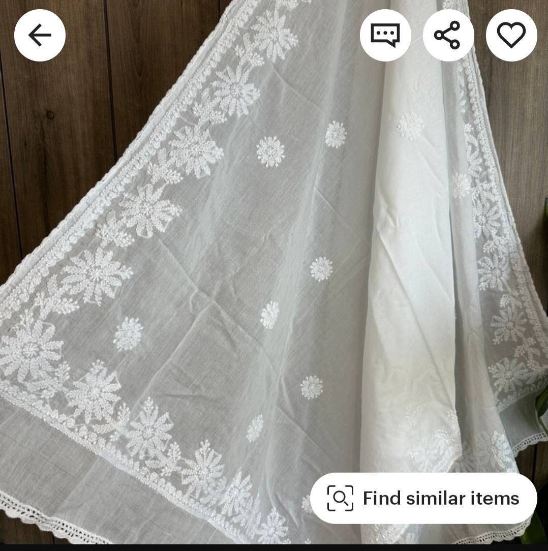 Classic white Chikankari pure cotton dupatta with hand embroidery and crochet lace.